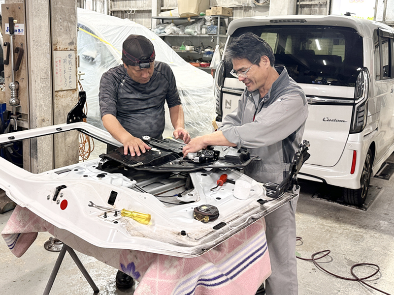 長年現場で経験を積んできた二人が語る、ヒーローの仕事。 台数をこなしながら技術を磨き続ける日々。 お客様からの感謝の言葉をいただける確かな技術力は、何よりの誇り。 車の進化に合わせて新しい技術も貪欲に吸収し続けられるのは、 今も変わらない「車が好き」という想いがあるから。 その原点こそが、仕事の面白さにつながっています。
